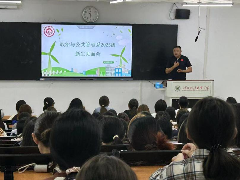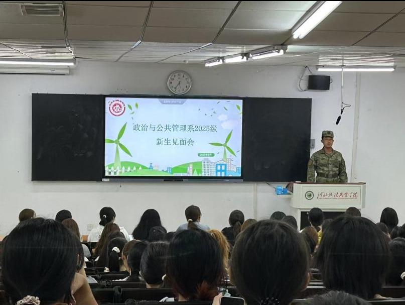 为助力新生迅速适应大学生活、增强对学校的认同感与归属感,强化安全意识,2025年9月5日下午五点,政治与公共管理系召开了2025级新生见面会。本次会议由辅导员贾东旭主持,军训教官、新生导助及全体新生共同参加。