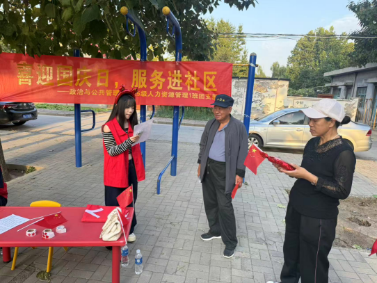2025级人力资源管理 1 班团支部以“国庆邻里聚 同心筑梦行”为主题,在杜北街道经贸社区开展国庆爱国教育实践活动。支部学生志愿者成立爱国教育专项小组,分工明确、服务精准。