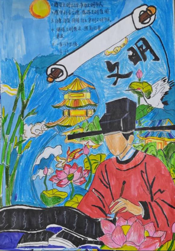 1. 《文明》:以蓝色为主色调,融入亭台楼阁等古典国风元素,将传统礼仪与现代文明要求结合,左侧罗列文明倡议要点,尽显文明古韵与新声。