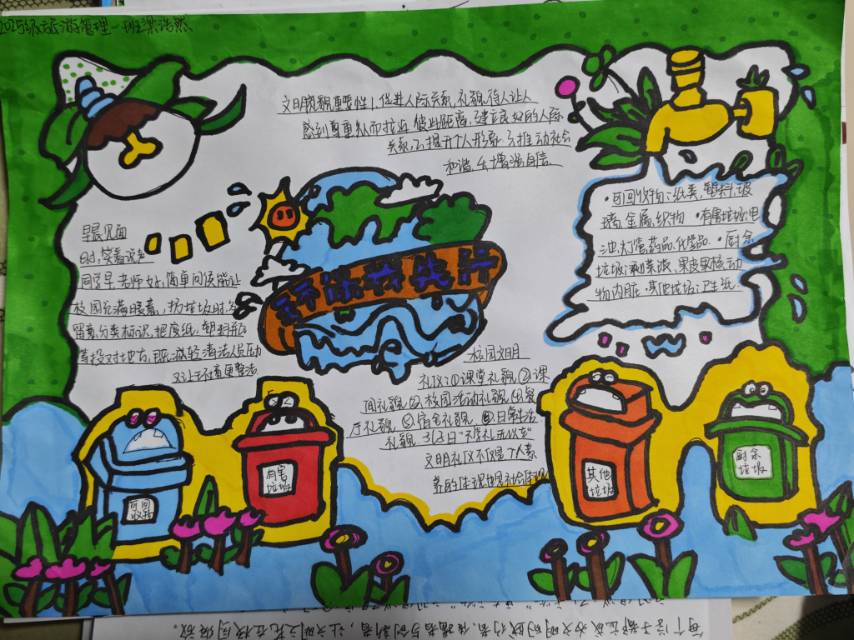 3. 《文明先行》:采用绿、黄、蓝撞色设计,从日常问候、垃圾分类等校园小事切入,标注垃圾分类标准,梳理多场景文明礼仪规范,让文明理念更直观。