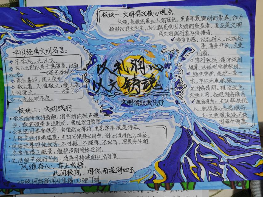 2. 《以礼润心,以文铸魂》:蓝黄水彩纹理为底,分两大板块,既阐述文明重要性,又摘录传统经典名言,还为校园文明行动提供具体指南,兼具思想性与实用性。