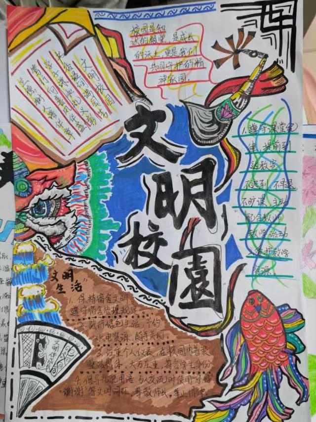 4. 《文明校园》:以文明校园为核心,搭配舞狮、锦鲤等吉祥元素,分栏列出课堂、宿舍、生活中的文明要求,紧扣校园实际传递共建愿景。